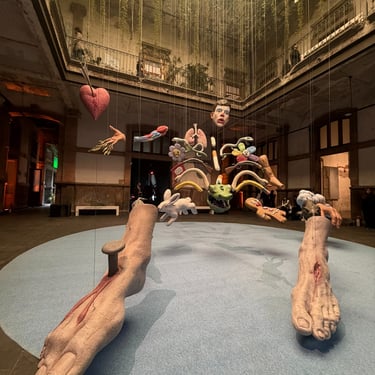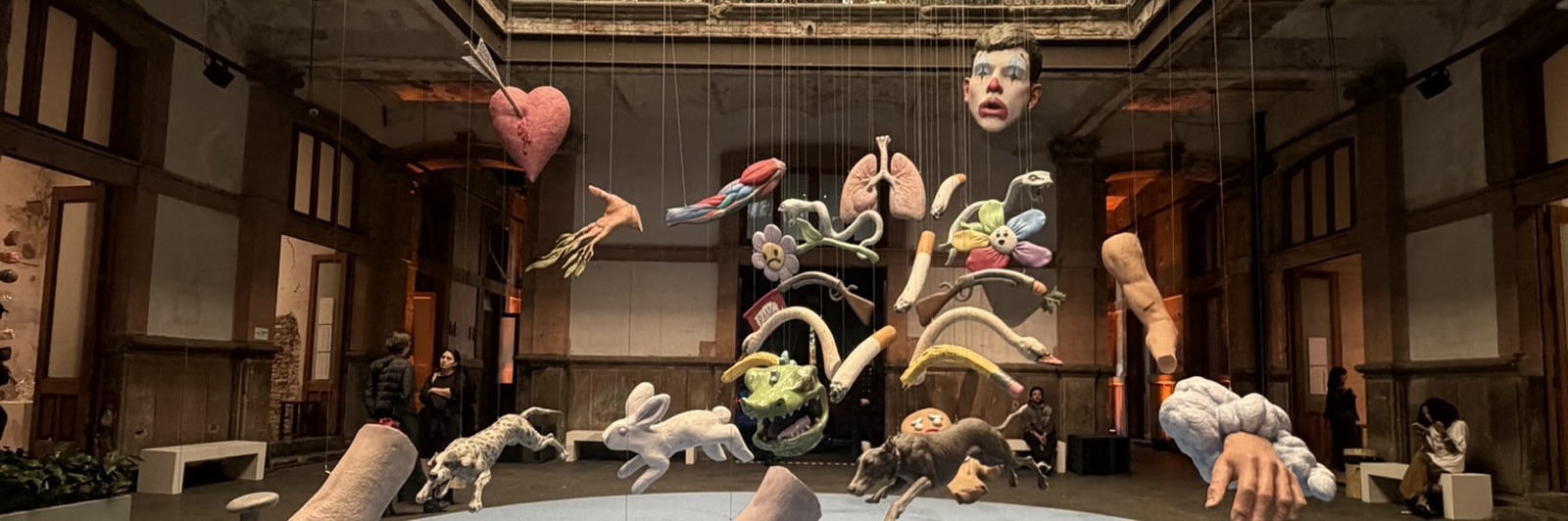 El recorrido se organiza en seis secciones curatoriales Convocatoria, Bodega, Estado, Proyectos, Patio y Sala que permiten leer el conjunto como un sistema de intensidades variables. Algunas áreas privilegian la intimidad del formato; otras, la escala y la inmersión. Al llegar al Patio, el cuerpo del espectador se ve confrontado por la instalación monumental de Enrique López Llamas, I am the Resurrection and I am the Life. La obra presenta un cuerpo fragmentado, caricaturizado, suspendido en el espacio: pies, órganos, animales, símbolos populares, gestos pictóricos hiperrealistas y una cabeza con rostro de payaso componen una anatomía imposible.
