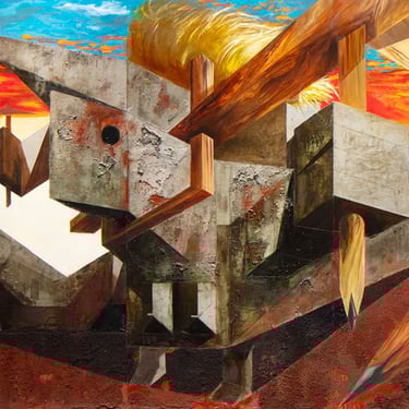 En términos formales, la obra despliega una serie de estrategias que refuerzan esta tensión entre construcción y descomposición. Las arquitecturas representadas aparecen fragmentadas, desproporcionadas o inestables, sugiriendo tanto la precariedad de las condiciones materiales como la imposibilidad de fijar una imagen estable del territorio. Esta distorsión no es un gesto meramente estético, sino una herramienta crítica que desarticula las formas convencionales de representación.